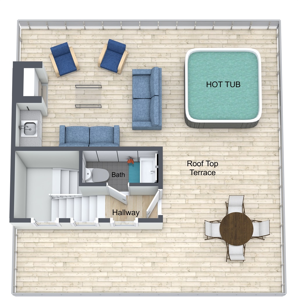 Hot tub, fireplace, and ample seating